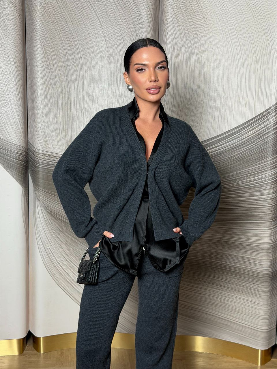 Материал: Брюки и кардиган: 100% шерсть мериноса, рубашка и пояс: 100% шелк